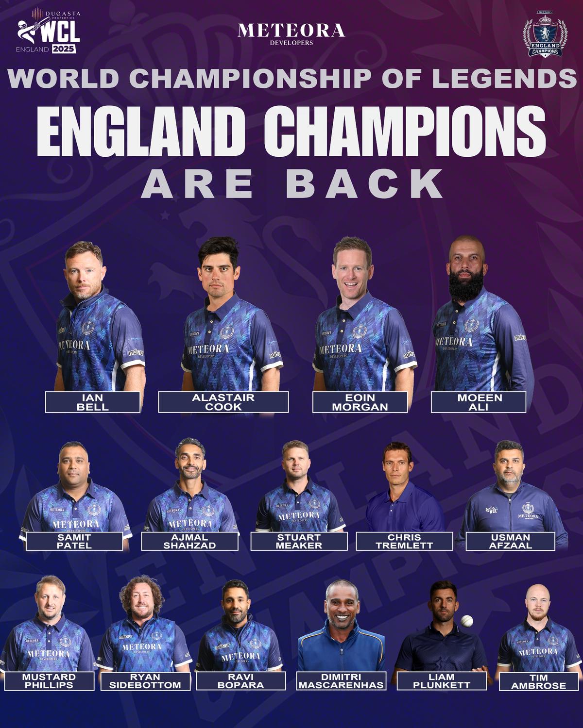 Cricketing icons Eoin Morgan, Sir Alastair Cook, Moeen Ali, and Ian Bell will headline the England Champions squad in the second edition of the World Championship of Legends (WCL), scheduled in the UK from July 18 to August 2.
